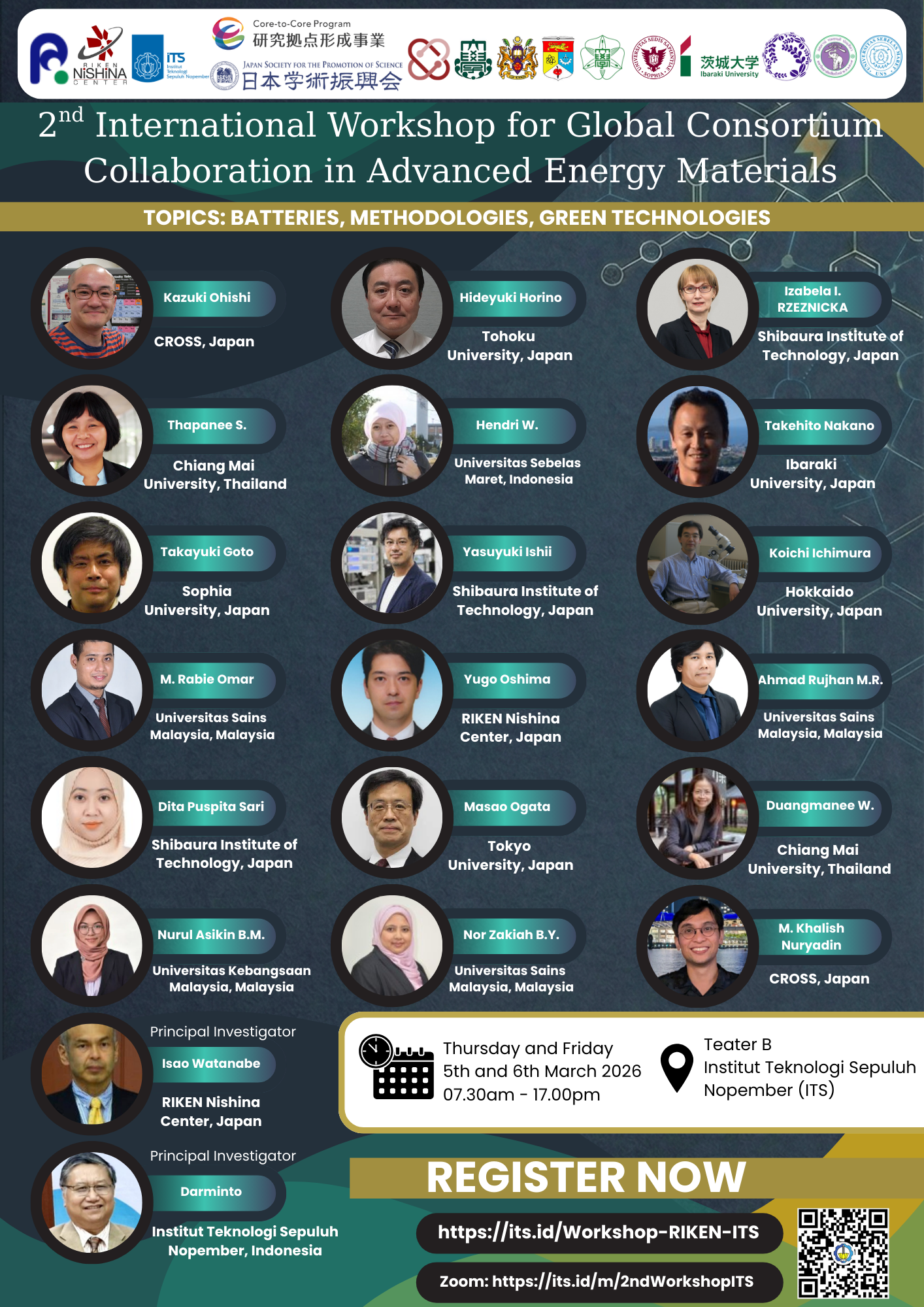 ขอเชิญผู้สนใจเข้าร่วมการสัมมนาวิชาการ “2nd International Workshop for Global Consortium Collaboration in Advanced Energy Materials” ซึ่งรวบรวมผู้เชี่ยวชาญและนักวิจัยชั้นนำจากหลากหลายสถาบัน อาทิ RIKEN, Tohoku University, SIT, CMU, USM และ UKM เพื่อร่วมกันแลกเปลี่ยนความรู้และสร้างเครือข่ายความร่วมมือระหว่างประเทศญี่ปุ่น อินโดนีเซีย มาเลเซีย และไทย